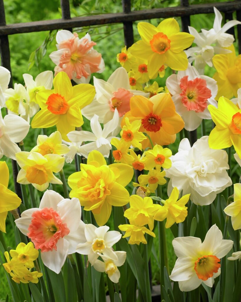 For big plantings where you want an extended bloom time, go with this superb mix of early, midseason and late varieties. Yellow, white, cream, orange; solids, bi-colors and bi-colored cups. Sizes and shapes to feed your every need, in the garden or in the vase. Previously called the Ninety Days of Narcissus Mix.