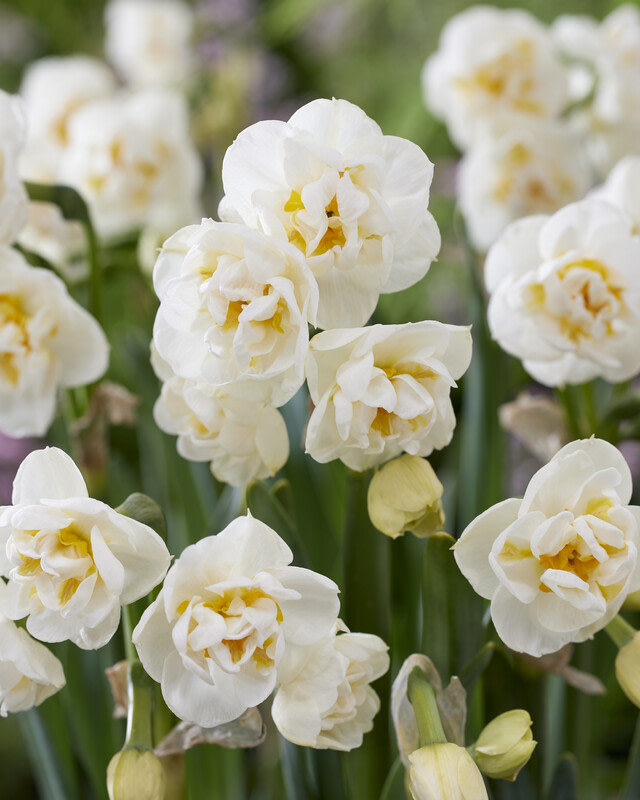 One of the earliest-blooming Doubles, each stem of this intoxicatingly fragrant variety produces 3–6 blooms. Refined white petals surround a frilly yellow cup with orange segments. Well suited to forcing.