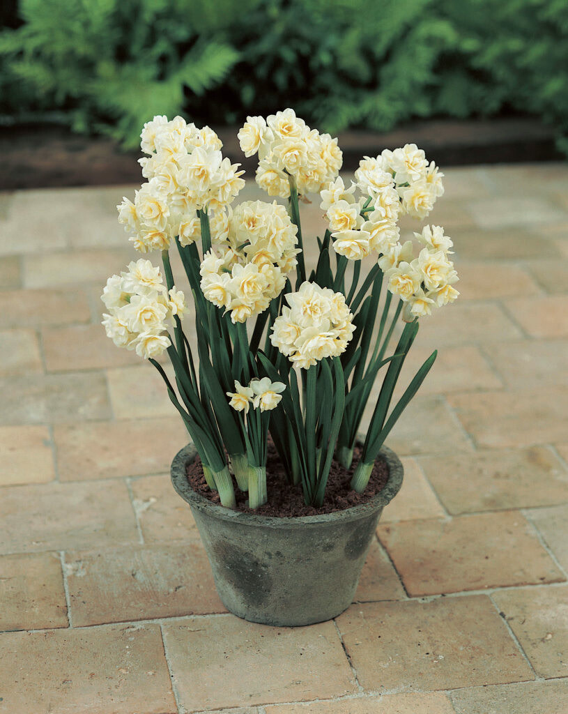 Creamy white petals with a highly doubled center flecked with yellow. Reminiscent of Cheerfulness both in appearance and fragrance, and pronounced Early Cheer. As many as 20 florets per stem. These can be a little finicky, so be sure to root them at the colder end of cool (45–50°) for best performance. tall.