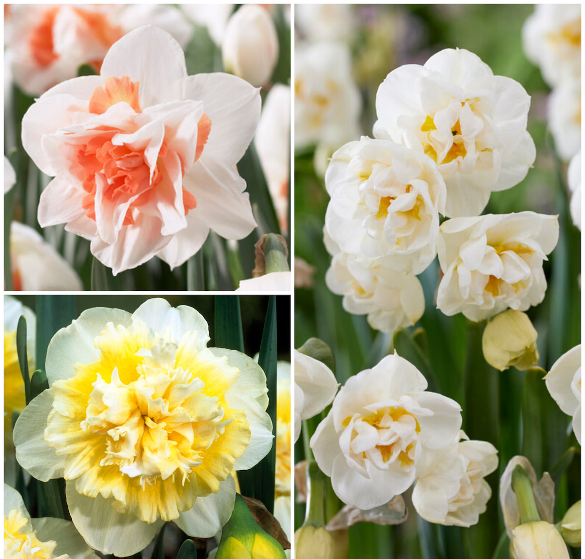 Fedco exclusive! A gorgeous selection of popular early blooming Narcissus with elaborate ruffles. 10 bulbs each of Bridal Crown, Ice King and Replete.