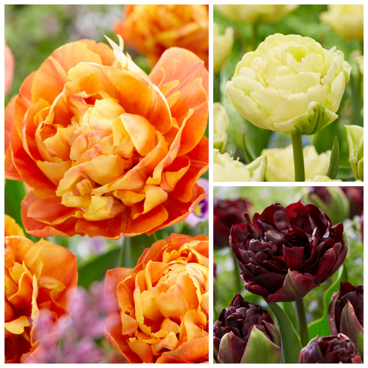 Fedco exclusive! Much like the beloved characters of the iconic TV show, these tulips exude sophistication and warmth with their antique shades of gold, burgundy and cream. Bring a touch of nostalgia and elegance to your garden. 10 bulbs each of three Double Early tulip varieties: Valdivia, Palmyra and Avant Garde.
