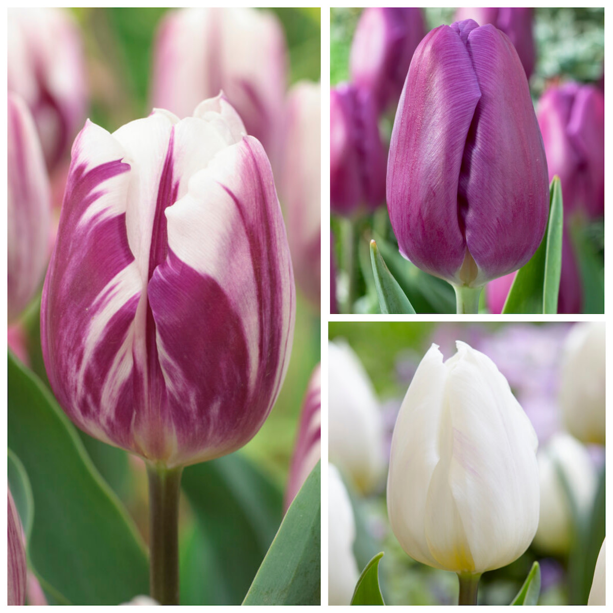 bulbs Mid-spring blooms. Fedco Exclusive! Let these pennants wave proudly in your garden, commanding attention and heralding the arrival of a splendid and colorful spring season. 10 bulbs each of three Triumph tulip varieties: Purple Flag, Flaming Flag and White Flag. Z3–7. 16-22" tall. ships in fall