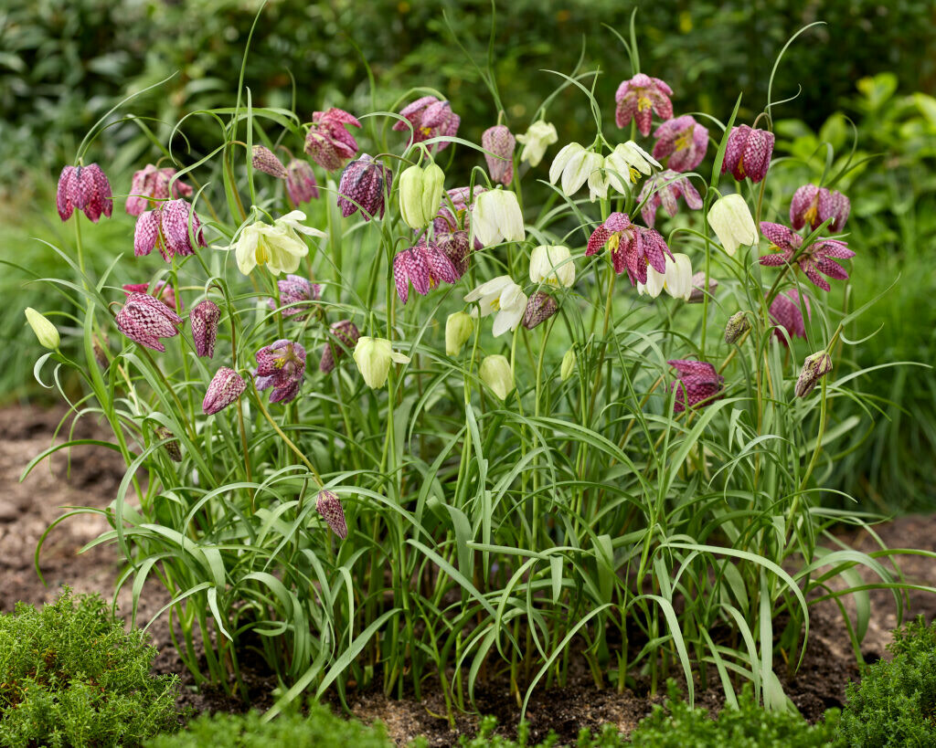 Checkered 1½" flowers in a mix of colors, mostly plum or bronze, with some lilac-pink or white. Delicate single bells hang on slender grey-green grasslike stems. Will spread in a well-drained sheltered spot; also suitable in borders, grassy or humusy areas.