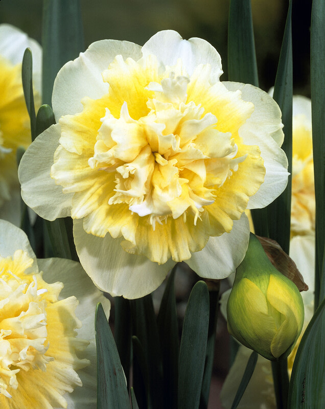 White petals surround a pleated pale yellow collar filled with a burst of lemony yellow center petals. A real show-off in the garden and perfect for spring bouquets.