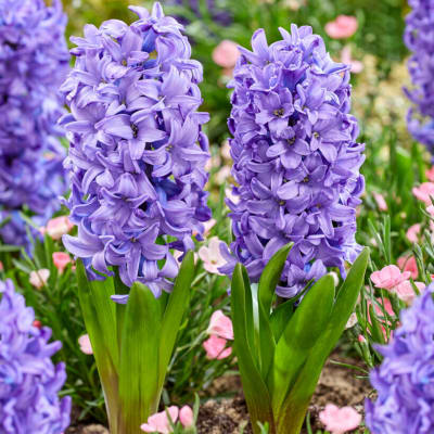 Hyacinthus orientalis Early to mid-spring blooms. The classic blue hyacinth for spring gardens and forcing indoors in winter.