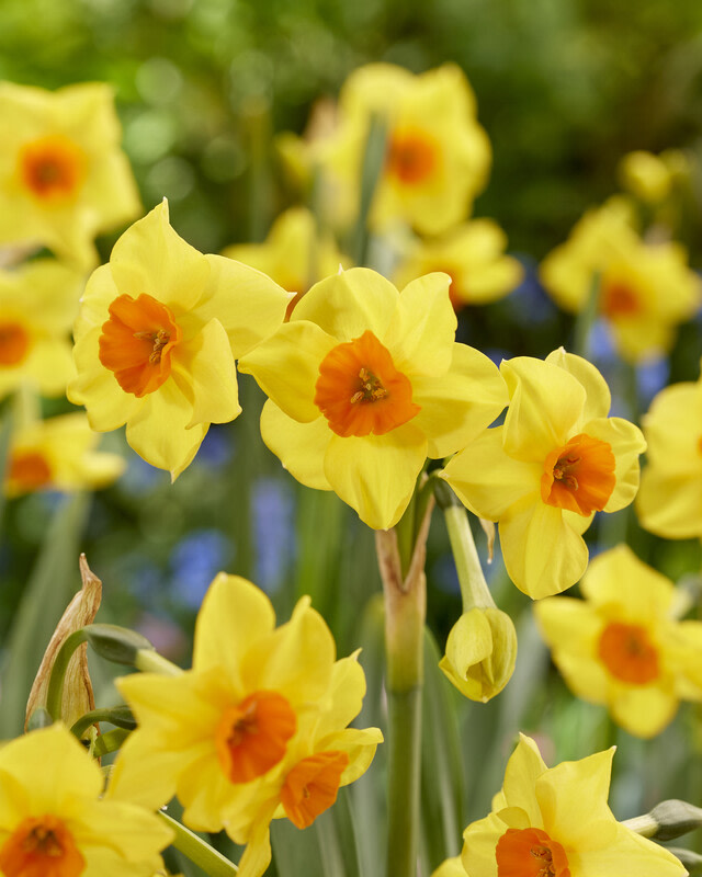 A carrot-orange short cup with a wavy rim, surrounded by bright yellow petals. Usually sends up multiple stems per bulb, with 4–5 highly fragrant blossoms per stem.