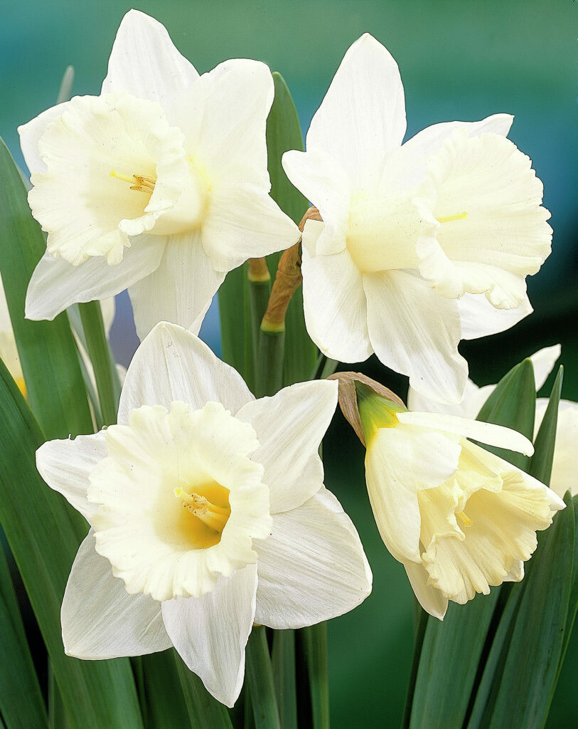bulbs Mid-spring blooms. Opens marble white to slightly pale yellow, and turns to pure white in a day or two. Broadly overlapping petals and a wide-mouthed wavy-edged trumpet. From 1938, this classic Trumpet is one of the finest white daffodils around. Z3-6. 14-16cm bulbs. 16-18" tall. ships in fall