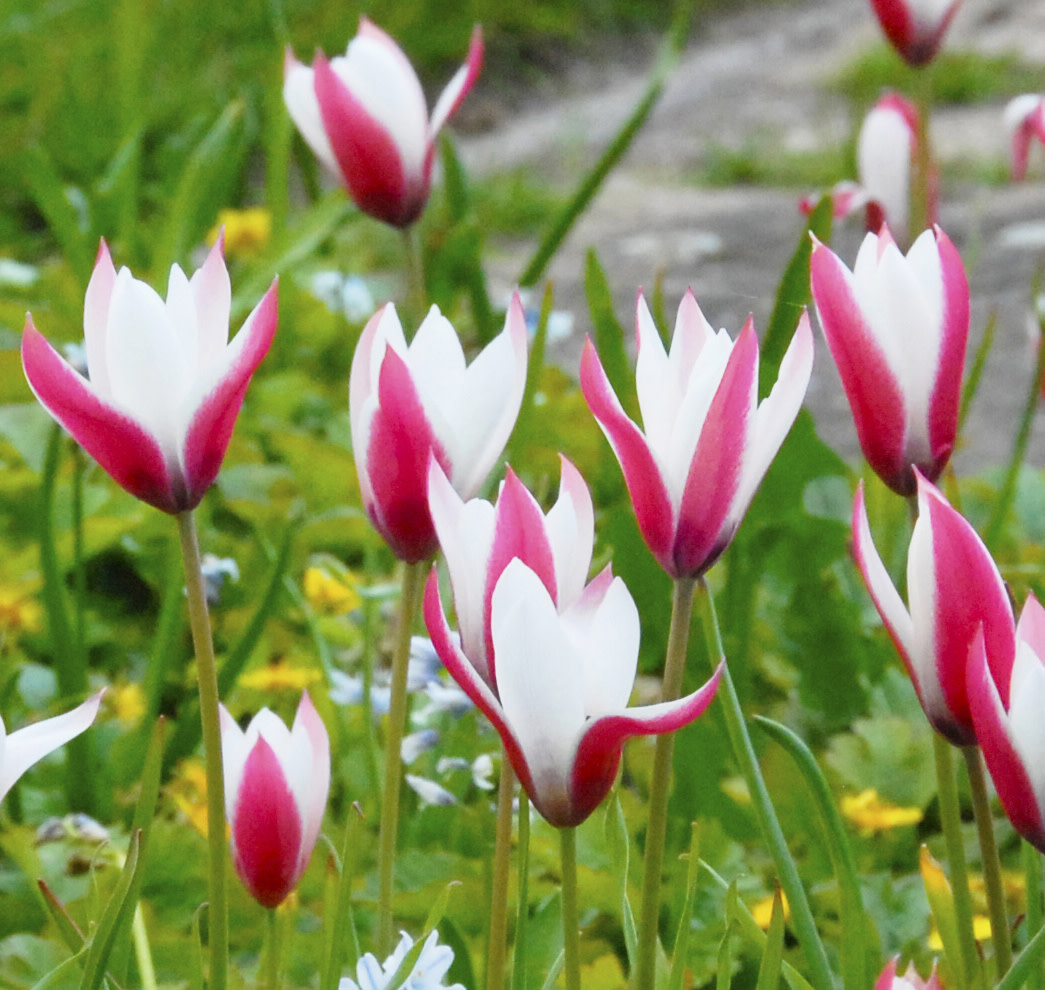Pointed petals are white inside with a dusty crimson-pink exterior edged with white. Looks like candy when closed in the morning, in the evening and on cloudy days. Opens wide in the sunshine to show a big white star with a royal purple base. One or two flowers per bulb. The species, native to the Himalayas, is called Lady Tulip.