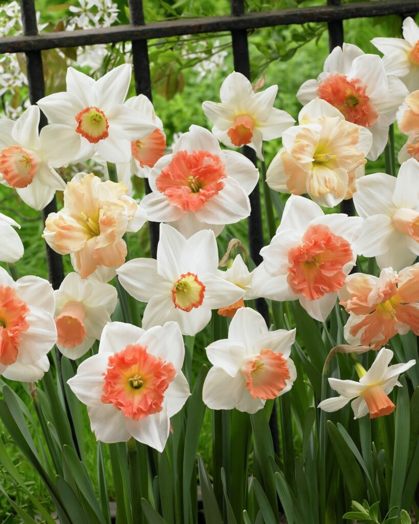 A soft blend of Narcissus, with cups in shades of coral, salmon, apricot and peach. Pairs beautifully with early season pink tulips.