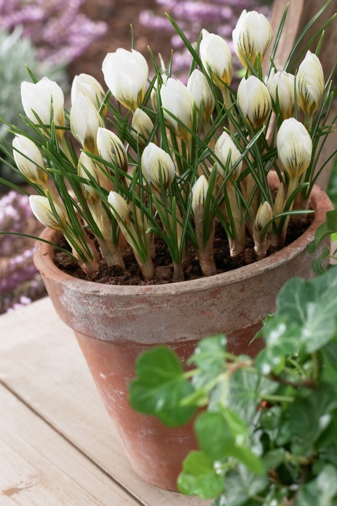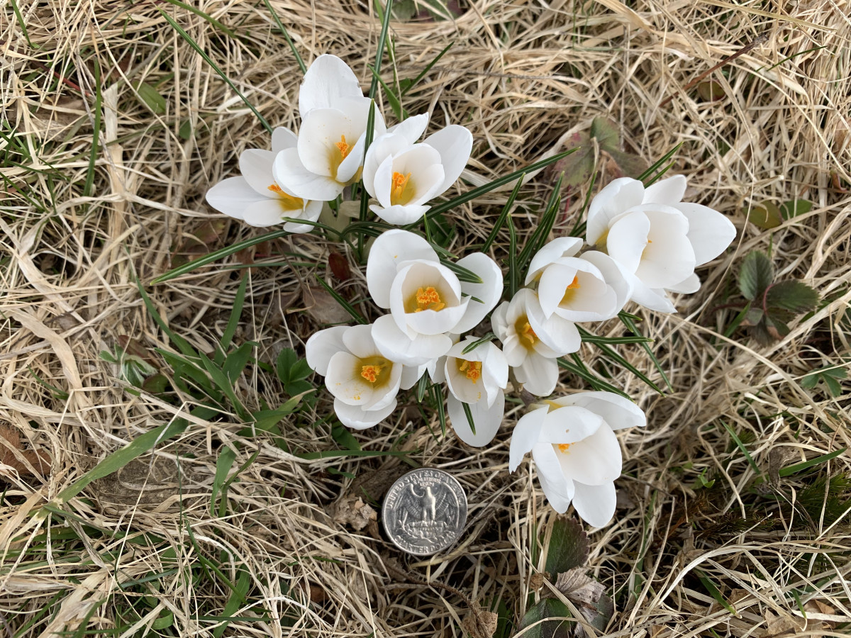 One of the earliest snow crocuses to appear in spring. Winter white with gold stamens, very lightly feathered grey-blue on the outside. Lightly fragrant.