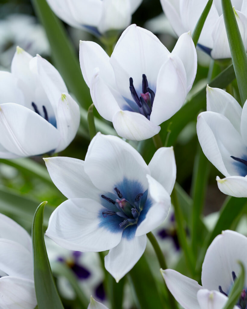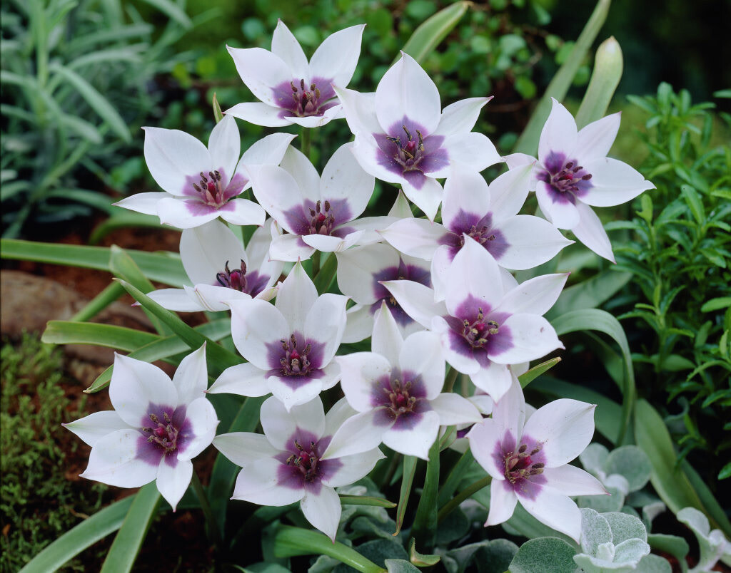 bulbs Tulipa humilis Early spring blooms. With its white petals and steely blue to violet centers, this unusual tulip will capture you in its gaze. Like many species tulips it naturalizes well if given space. In warmer zones it appreciates some midday shade. Z3–8. 5/6cm. 6-8" tall. NEW! ships in fall