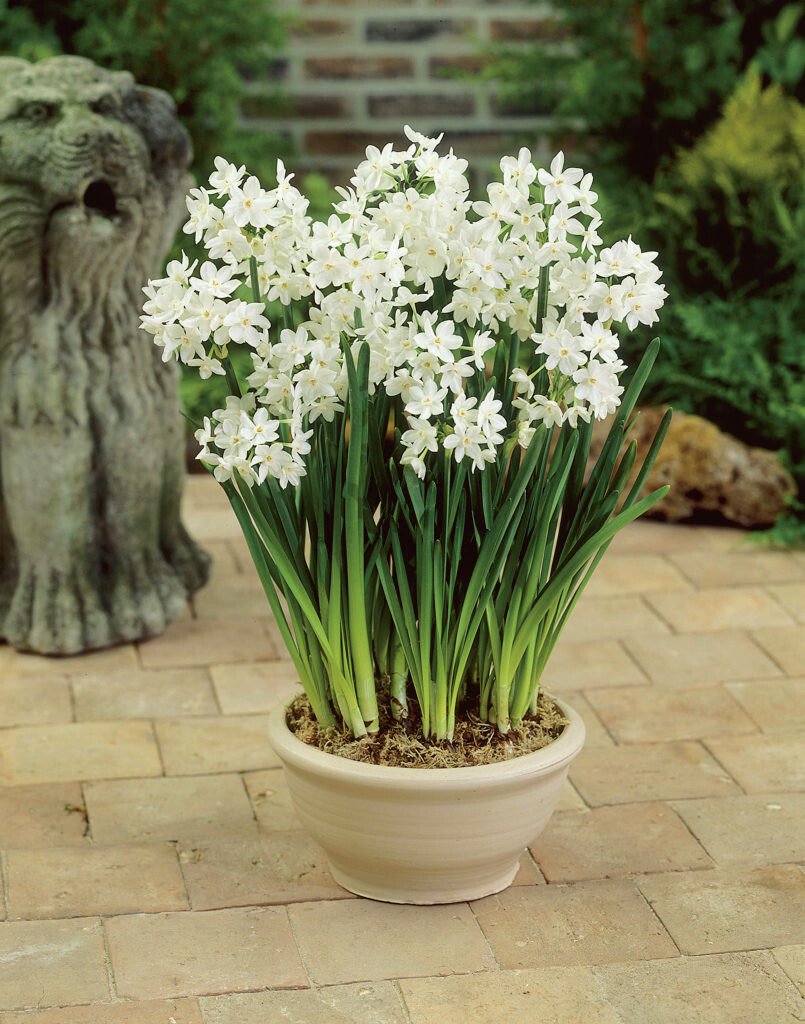 bulbs Narcissus tazetta The earliest paperwhites. White flowers bloom early with strong musky spicy fragrance. Has the most flowers per stem, and is one of the quickest to bloom once planted. If you don’t plant until late winter, you’ll find them growing in storage! tall. 16-18" tall. ships in fall