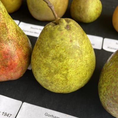 Pyrus communis Late summer. Small obovate yellowish-brown russeted pear with slight red blush. Often considered the best-flavored of all pears. Good fresh and cooked. Z4.