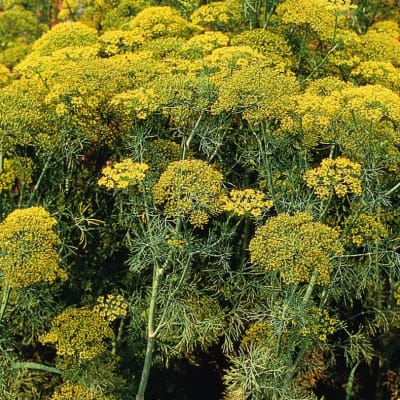 Name derived from the Norse dilla, meaning ‘to lull,’ as the plant is said to have soothing properties. Best known in this country for pickling, but essential for Russian, Polish and Hungarian cuisine. Annual, sometimes classed as biennial, grows to 4–5'. Self sows. Upright plant branches out from single stalk; the feathery leaves known as dill weed. Likes well-drained moderately rich soil.