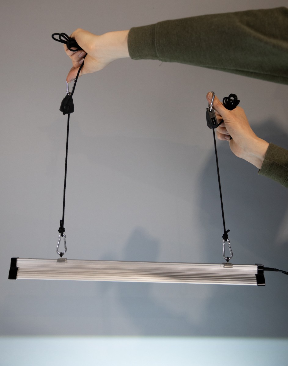 If you already have a cart, shelf or some other structure to suspend LED grow lights from, this handy hanger gives you maximum height customization and ease of adjustment. Set of two ratcheting hangers with carabiner hooks. 75-lb load capacity—that’s the average weight of a 10-year-old.