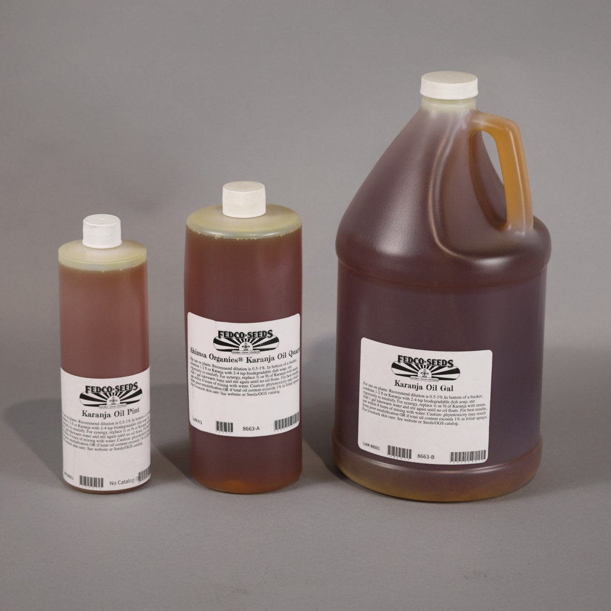 Pressed from the seed of the pongam tree of India, the oil is rich in several bitter flavonoids that stimulate plant immune function. Numerous studies have shown the oil to prevent many pests from feeding and laying eggs and to kill pests such as mites, aphids and leafminer larvae. Studies also show karanja works synergistically with a number of pest management sprays—especially Neem Oil—to significantly improve their efficacy, and it lasts longer on plants than other botanical insecticides.