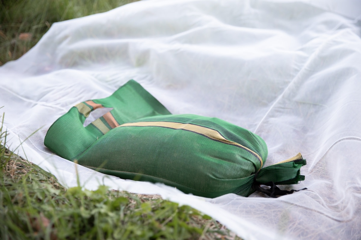 Green bag with a yellow stripe down the center. 15x26" when empty and flat. Note: Not recommended for 17g or 25g ProtekNet because the edges of the row bag can catch and tear lightweight nettings.