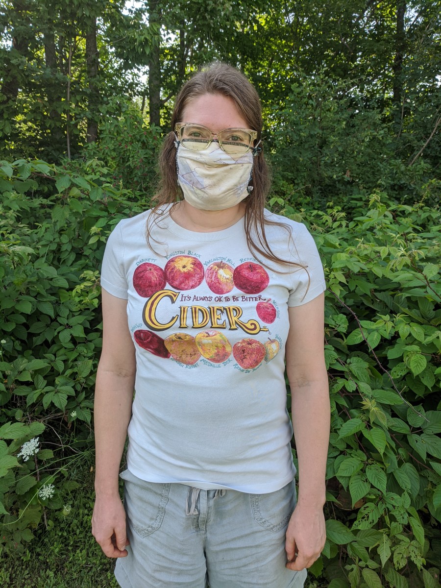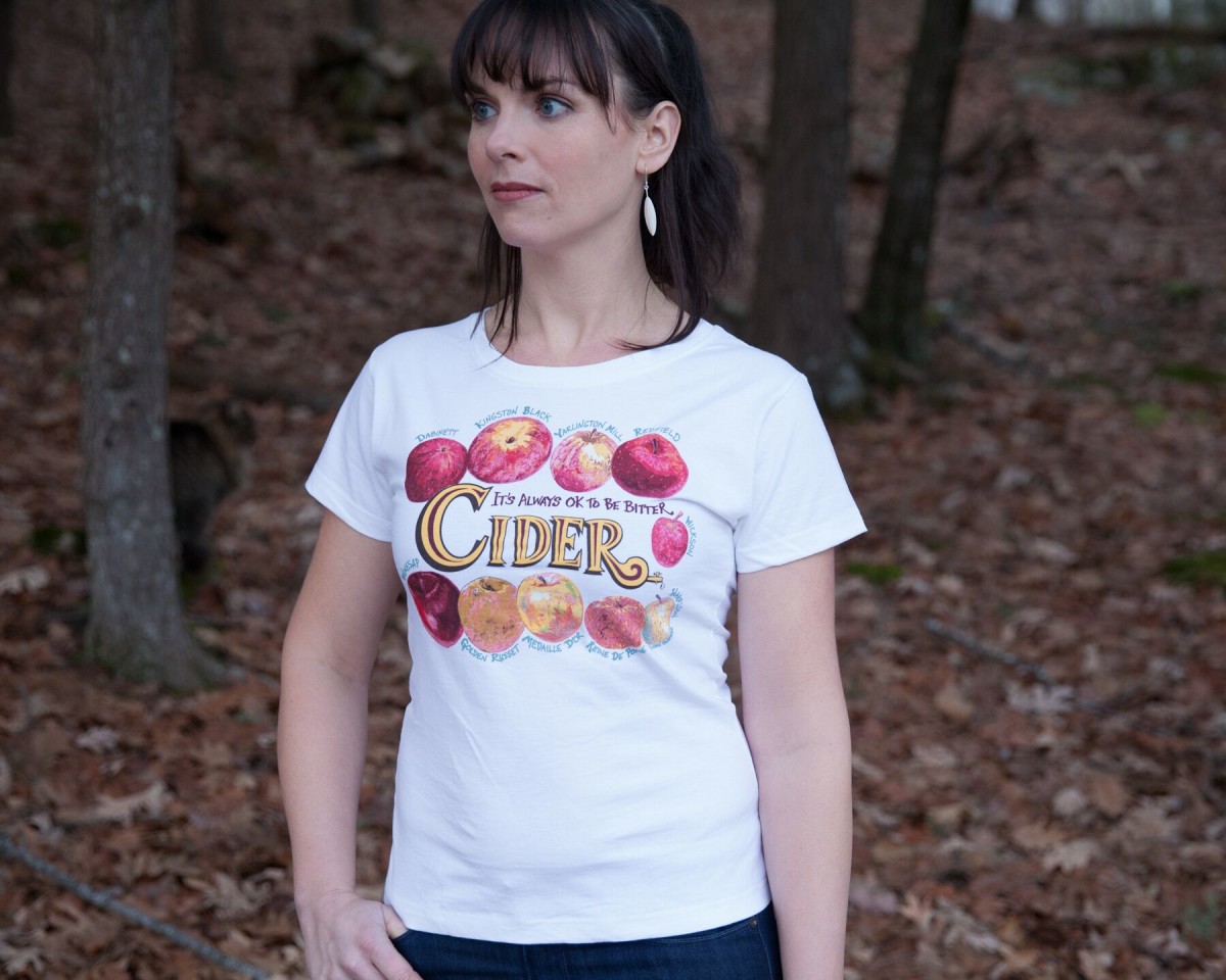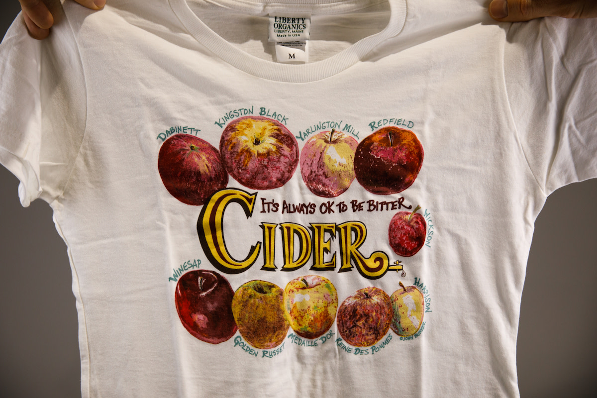 Celebrate your favorite fall drink with our popular cider T-shirt, featuring John Bunker’s full-color paintings of ten of the most famous English, French and American cider apples and the catchphrase “it’s always ok to be bitter.” This white shirt has a scoop-neck and a fitted cut. 100% organic cotton.
