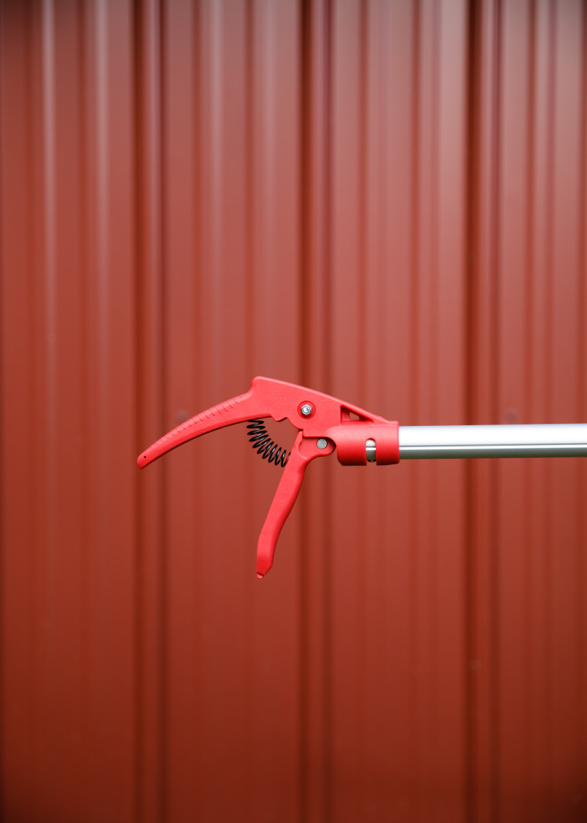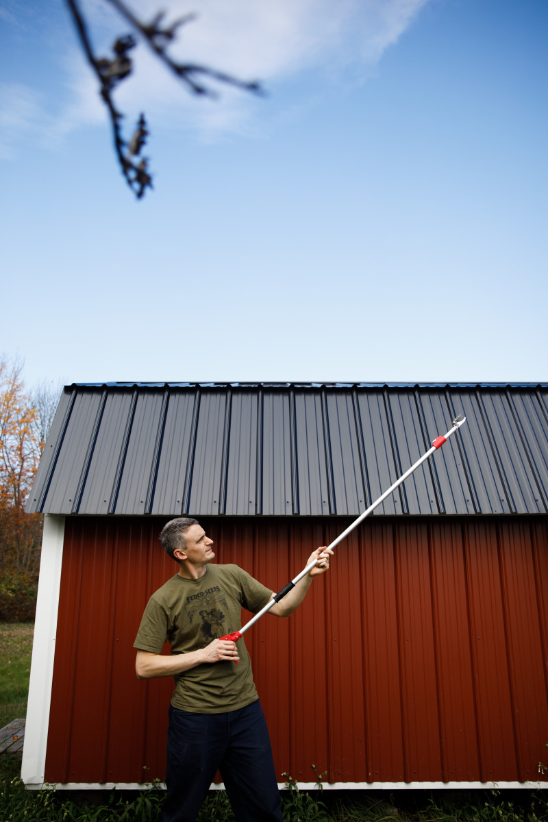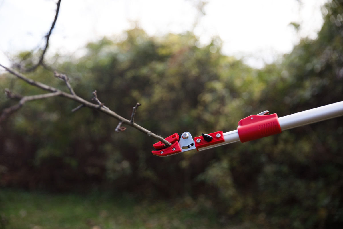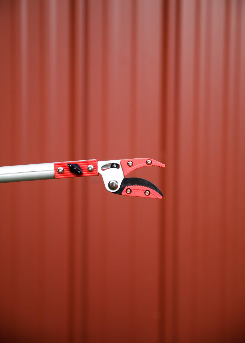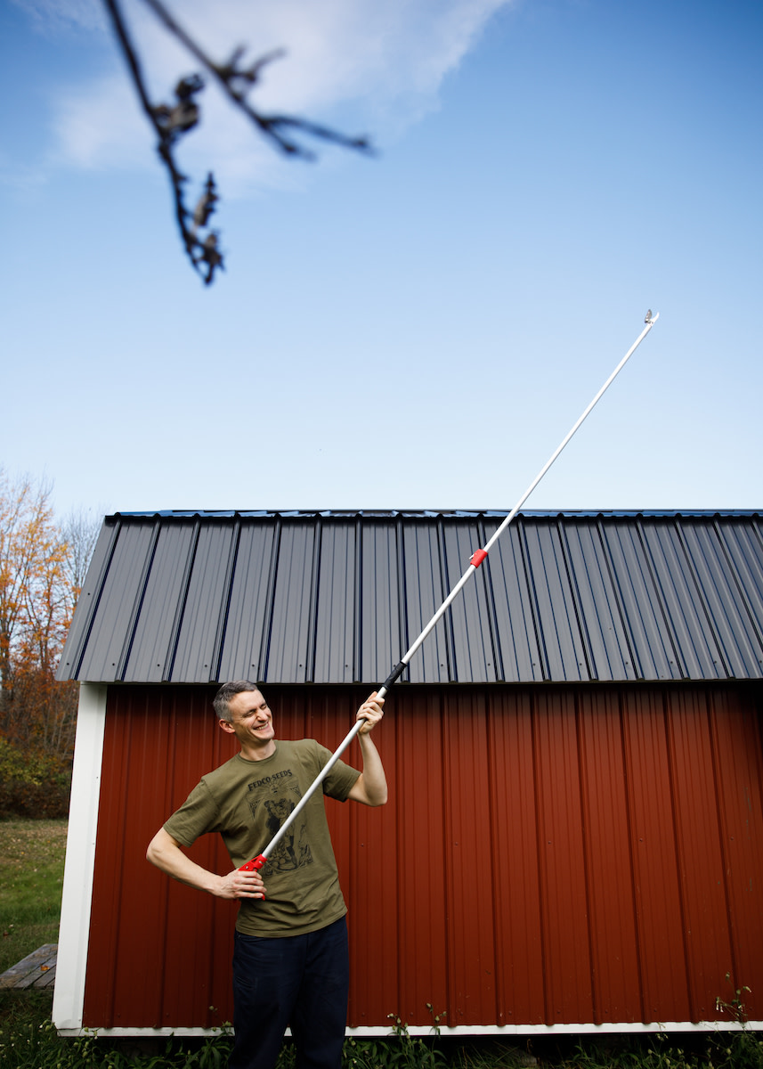 Every winter Fedco veteran and arboreal enthusiast Mike Smith uses this type of pole pruner to remove browntail caterpillar nests from his orchard. The distinctive cut-and-hold feature allows you to grab the lopped off nest and release it over a collection bucket, so you can later burn the nests or drown them in soapy water. (If you just leave nests on the ground, the caterpillars can survive and make their way back to the tree in spring.) The ideal time for this job is late winter before caterpillars emerge. Many applications for a cut-and-hold pruner beyond browntail removal—you could harvest those fragrant delicious black locust flowers way up high. Sturdy yet lightweight telescoping aluminum pole can extend from 5'11" to 9'10"—someone of average height could cut more than 17' from the ground. The holding piece can be removed for more typical pruning work, suitable for branches up to ¾" in diameter. The grip can be swiftly rotated 180° relative to the cutter head, to orient it according to your needs. Made in Taiwan.