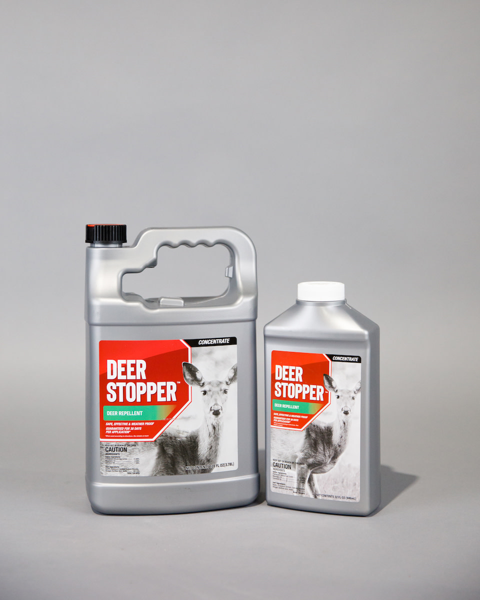 A mixture of rotten eggs and essential oils deters deer by taste and smell. Dries clear and odor free (to human noses) and will not wash off in the rain.