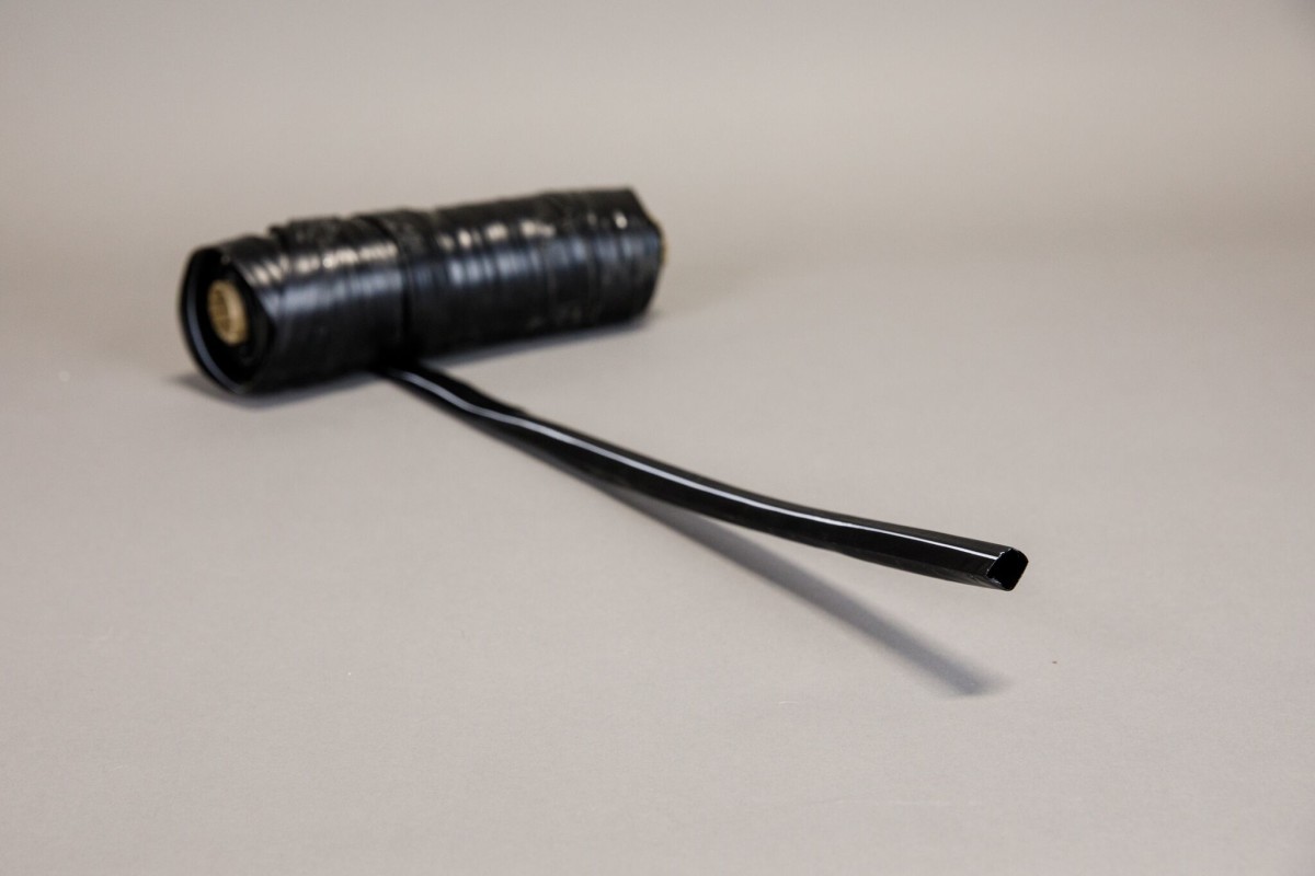 10 mil, ⅝" diameter low-flow drip tape drips every 8", rated at 20 gph/100'. The optimal orientation of drip tape when it is laid out is with the slits (striped side) facing up to the sky, which is a bit counterintuitive, but the reason being that this prevents clogging by small particulates that will settle to the bottom of the tape.