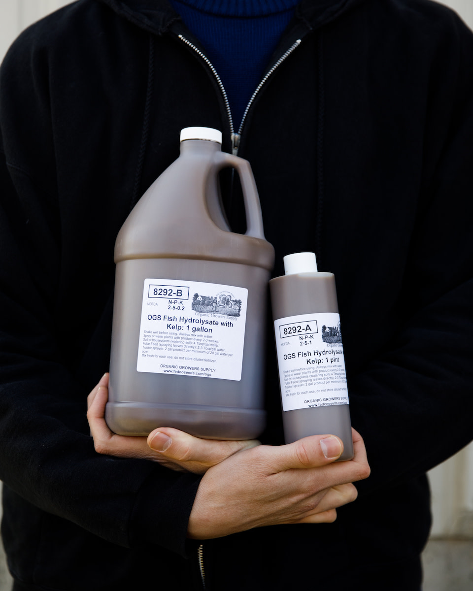 (2-5-0.2) All the nitrogen, phosphorus and potassium of fish, along with the micronutrients and growth hormones of kelp. The solution is stabilized with phosphoric acid, potassium sulfate, and sodium nitrate. The wild fish scraps come from the fishing industry along the Great Lakes. Can be used as a foliar feed, in drip irrigation (be sure to filter it after mixing with water), and for better seed germination & seedling growth. Alice’s preferred drench for onions and other early transplants; provides readily available nitrogen when microbes are still sluggish in cold spring soil and encourages vigorous rooting. Improves plant vigor and stress resistance, increases storage life of produce.