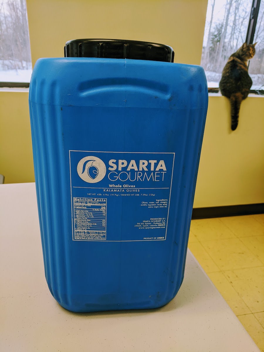 4.75-gallon food-grade jug. Is your harvest worthy of being kept fresh and safe in containers bearing the name of Sparta, the prominent city-state in ancient Greece known for its unsurpassed military strength? These high-density polyethylene (HDPE) containers were, in fact, manufactured in none other than Athens, Greece, and they previously contained olives grown and sold out of modern-day Sparta. These containers are sold as-is, meaning they have a little olive residue. Dimensions: 9" x 9" wide, 15" tall.
