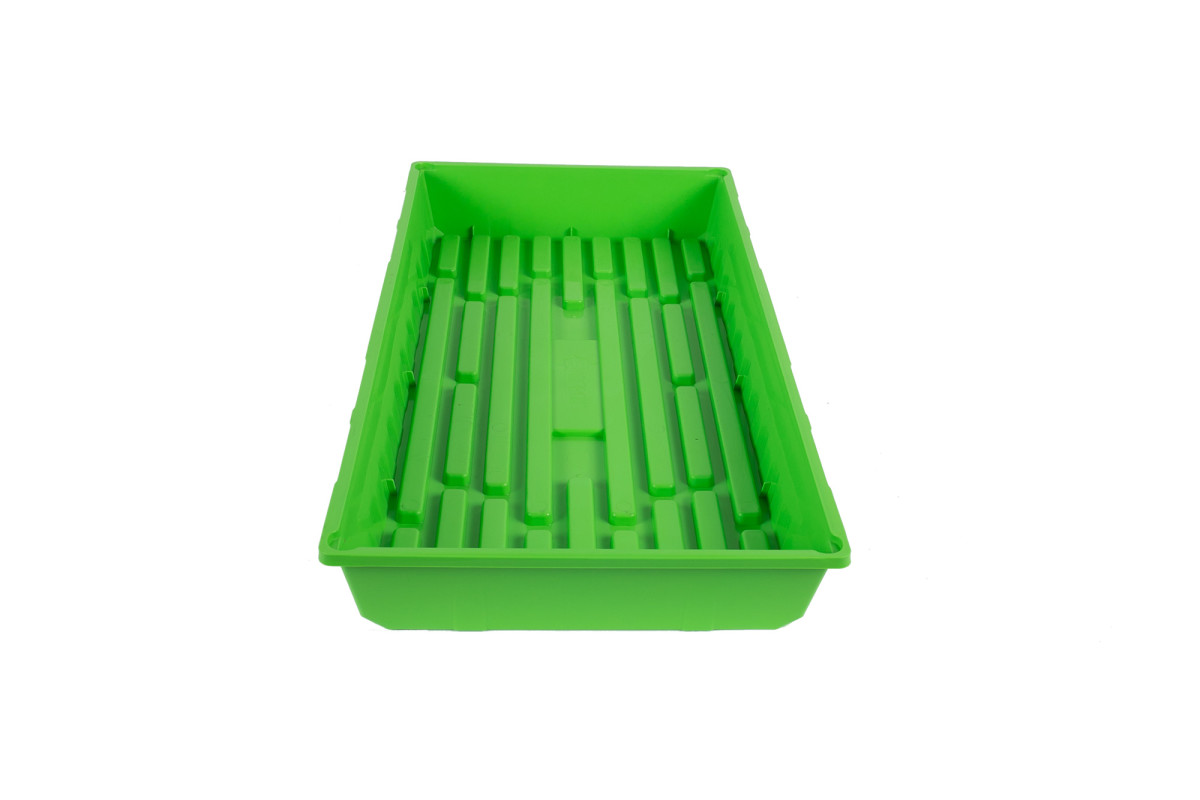 These super-solid injection-molded SUNPACK trays have no drainage holes, so they’re leak-proof and great for bottom-watering. Ribs along the bottom provide good airflow for whichever pots or cell trays you set in them. With the rib height subtracted, there is 2¼" usable depth. Outer dimensions: 11x21⅛". Comes in multiple colors.