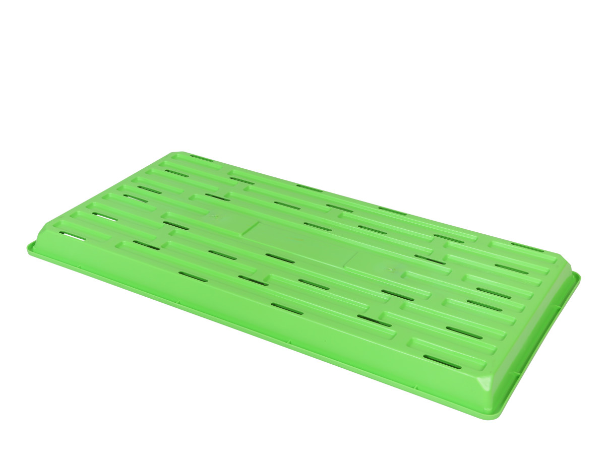 Sturdy shallow-rimmed injection-molded bottom trays with 1" of usable depth are a must-have for growing microgreens, and great support for pots and plug flats. More rigid structure than mesh-bottom trays. They come with drain holes (in multiple colors) or without drain holes (in black)—both styles have ribs to allow drainage beneath pots. Outer dimensions: 10¾x21".