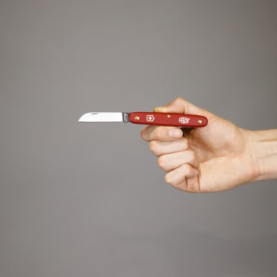 This stainless steel grafting knife with 2¼" blade is beveled on only one face so the cut is as flat as possible. Manufactured by Victorinox in Switzerland.
