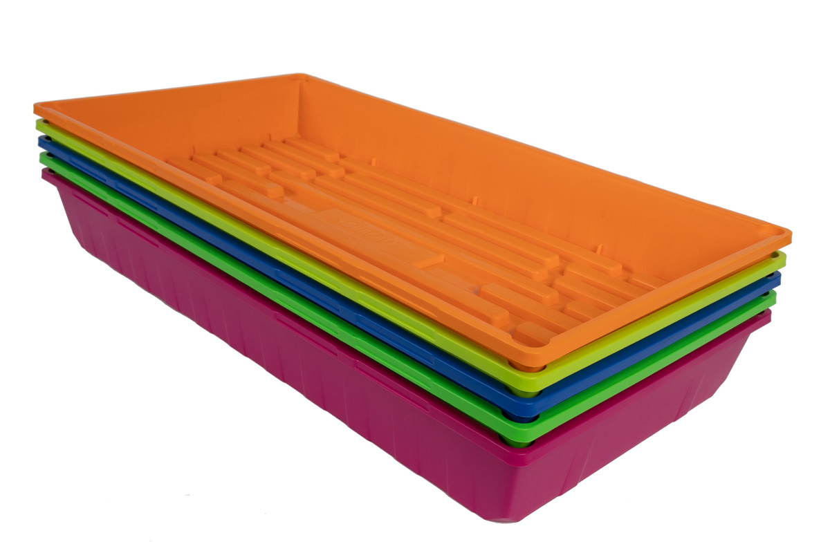 These super-solid injection-molded SUNPACK trays have no drainage holes, so they’re leak-proof and great for bottom-watering. Ribs along the bottom provide good airflow for whichever pots or cell trays you set in them. With the rib height subtracted, there is 2¼" usable depth. Outer dimensions: 11x21⅛". You can also buy single trays separately in multiple colors.