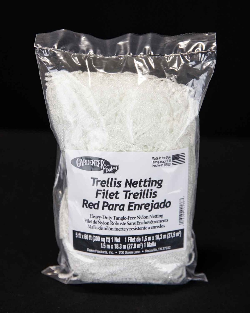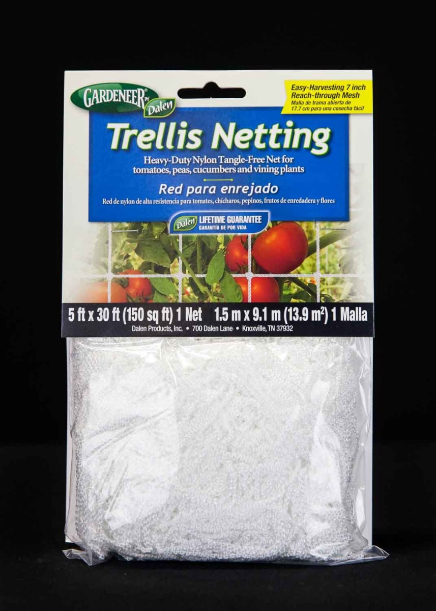 7" reach-through nylon mesh with a strand strength of 60# for tomatoes, climbing beans, peas, cucumbers and luffas. Weave a strand of fence wire through the top for extra support. Will last for many years if you can avoid “the tangles”!