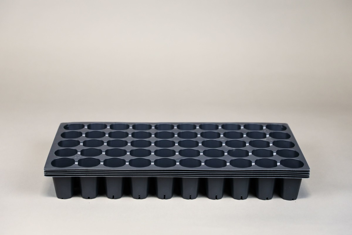 Also known as Pro Trays. Fit into standard 1020 Trays for easy handling in the greenhouse. Made of lightweight black plastic with bottom drain holes. 50 round cells in a sheet, 1.88" wide, 2.31" deep.