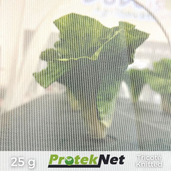 A durable floating row cover that excludes all manner of insect pests, even those as small as thrips, flea beetles, aphids, and two-spotted spider mites. Also protects against birds and rabbits. This knitted UV-resistant polyamide mesh eliminates the need for spraying pesticides, and it lasts at least 2–3 times as long as the cheaper spunbonded fabrics like Covertan or Agribon. OGS staffer John Paul discovered insect netting in 2014, and he quickly transitioned to using it wherever he could instead of spunbonded fabric. His crops performed better and it made the whole experience of growing vegetables easier and more aesthetically enjoyable. See Additional Info box below for more details on ProtekNet versus Covertan for crop protection. Use with Wire Hoops. If you bury the edges of netting with soil, do what you can to prevent weeds from growing through the buried edges.