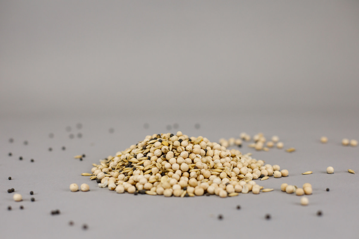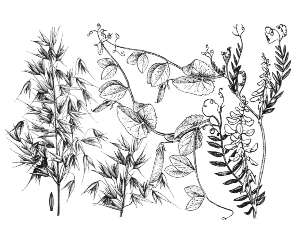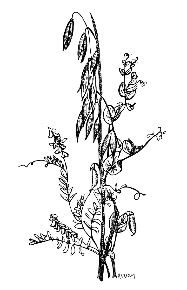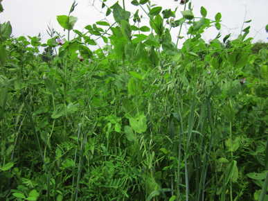 71% field peas, 15% common oats and 14% hairy vetch. A superior soil-building cover crop seed mix. For springtime planting: allow for 60–90 days of growth. The oats come up first and are pulled down by the peas, which are eventually pulled down by the smothering vetch. Weeds don’t stand a chance in that jungle. 4" mat of vegetation should be disked or mowed and incorporated in autumn. Seed at 150–200#/acre, 5#/1000 sq ft. All three components are certified organic.