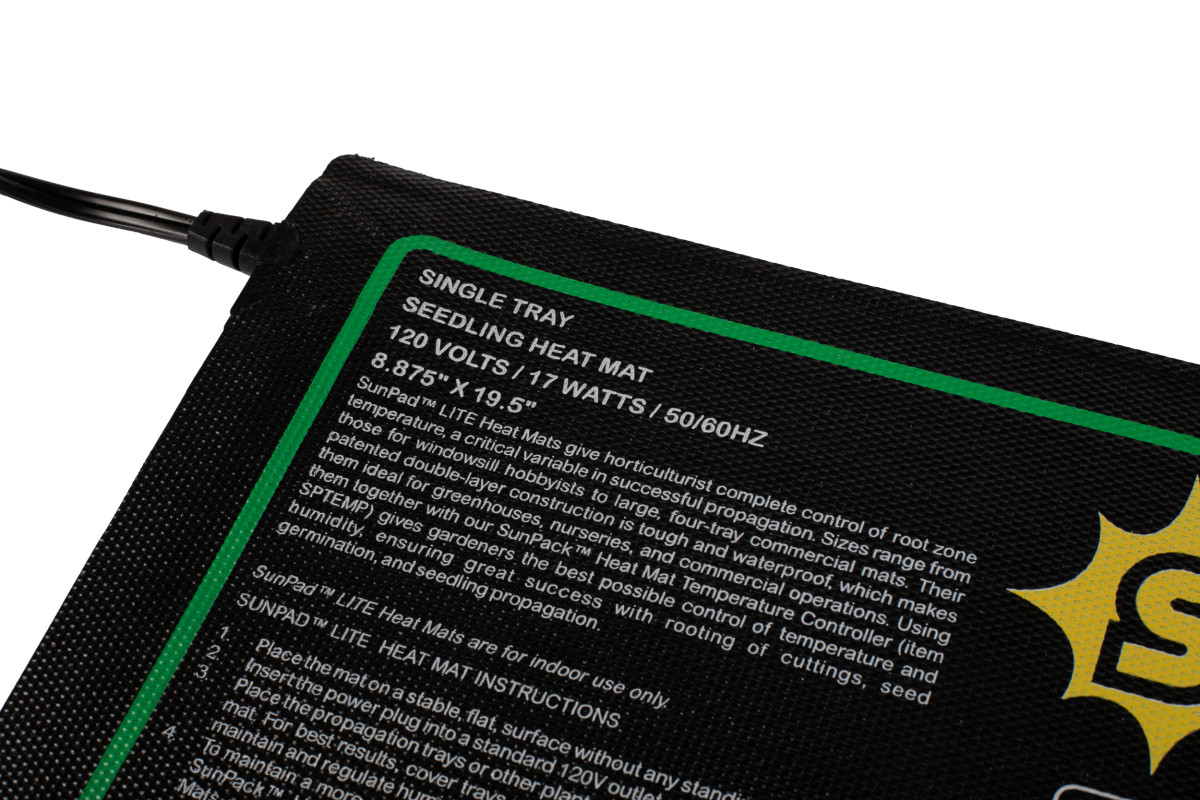 The patented double-layer construction is tough, waterproof and easy to clean. The patented safety fuse cuts power to the mat if any hot spots develop. The power cord contact points are built with extra-thick yet flexible molding, making them resilient to pulling stress. Printed on each mat is helpful info about lighting, watering, and germination. Includes 6' 120V power cord. Covered by a one-year warranty.