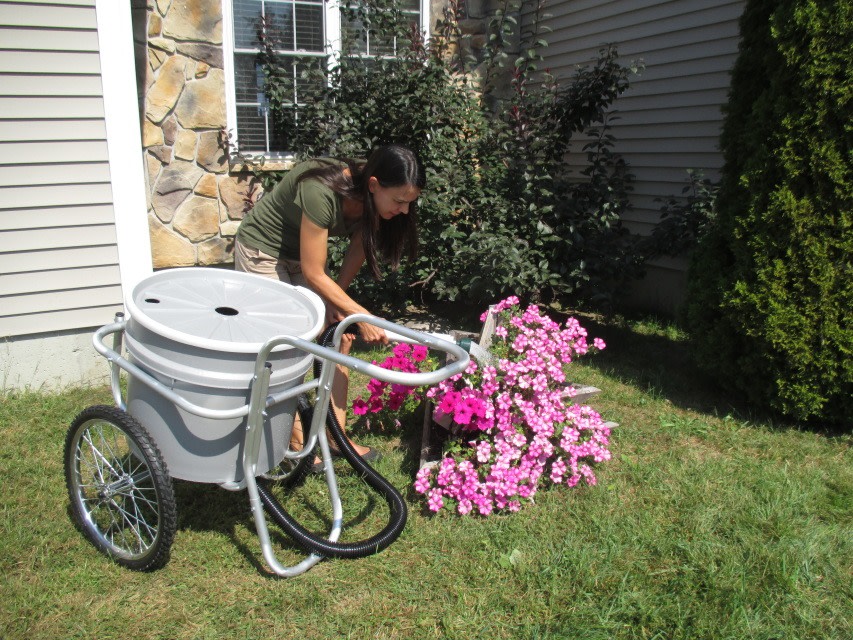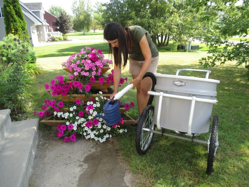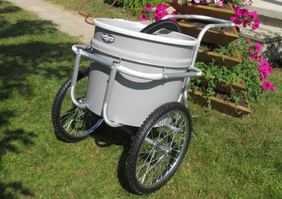 Sturdy and ergonomic cart makes hauling twenty gallons of water to remote garden spots or animals a breeze. No pumps, no fuss, just gravity. Equipped with a kink-resistant, crush-resistant hose with quick-connect flow tips so you can choose a heavy flow or a gentle sprinkle. Come winter, you can lift out the tub and use the cart to haul your firewood. Comes with wire-rimmed pneumatic tires that are 2" wide and 20" in diameter, which are good for hauling loads up to 400 lbs over uneven terrain.