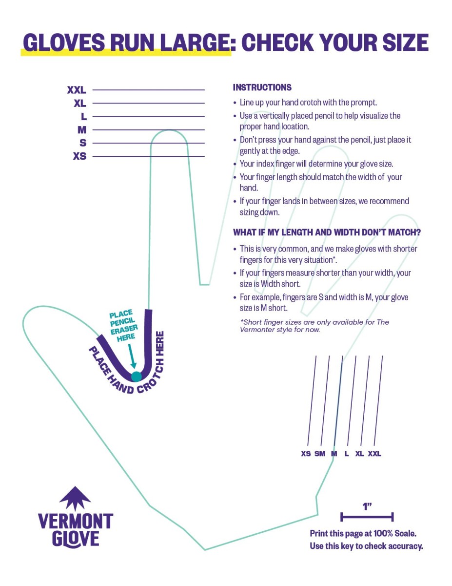 Size is based on measurement around knuckles; print this PDF, making sure to print at 100% Scale and Do Not Resize, and finally check the 1-inch key at the bottom right corner of the printout with a ruler make sure the scale is accurate. If you don't have a printer, please watch this short silent film. Vermont Gloves tend to run larger than other brands, so please be sure to measure before you order!