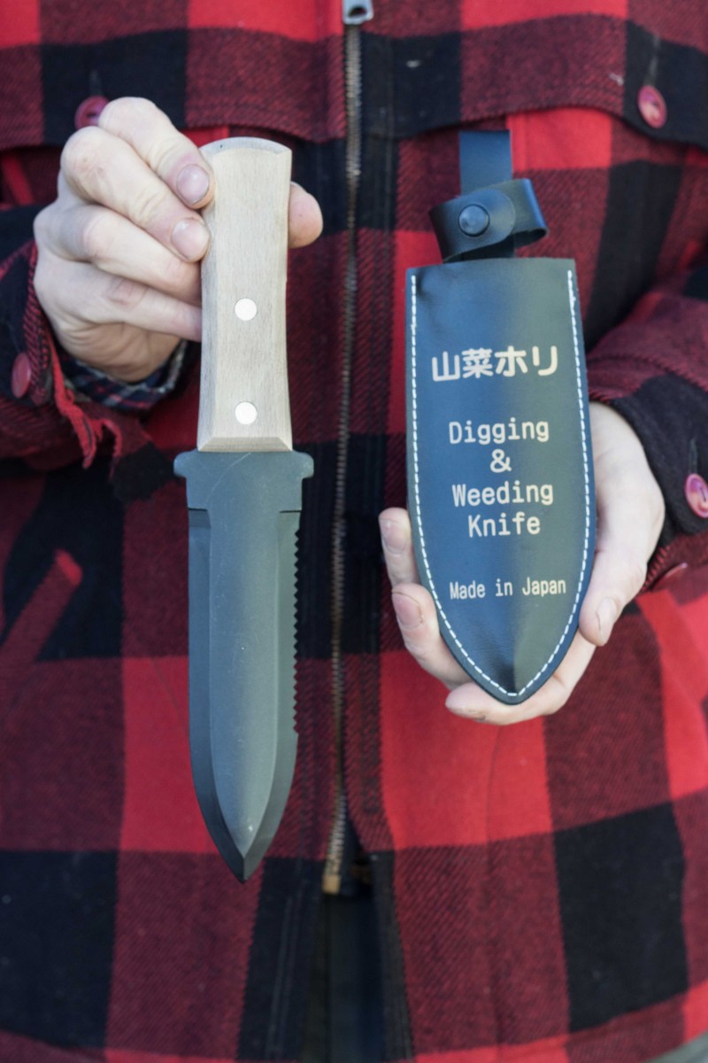 Good for prying out taprooted weeds, knocking soil from sods and weed clumps, planting bulbs and strawberry crowns, for general cultivating and for sawing small roots or heavy stems, though not as sharp as a knife or a saw. 6½" blade, 11¼" long overall.