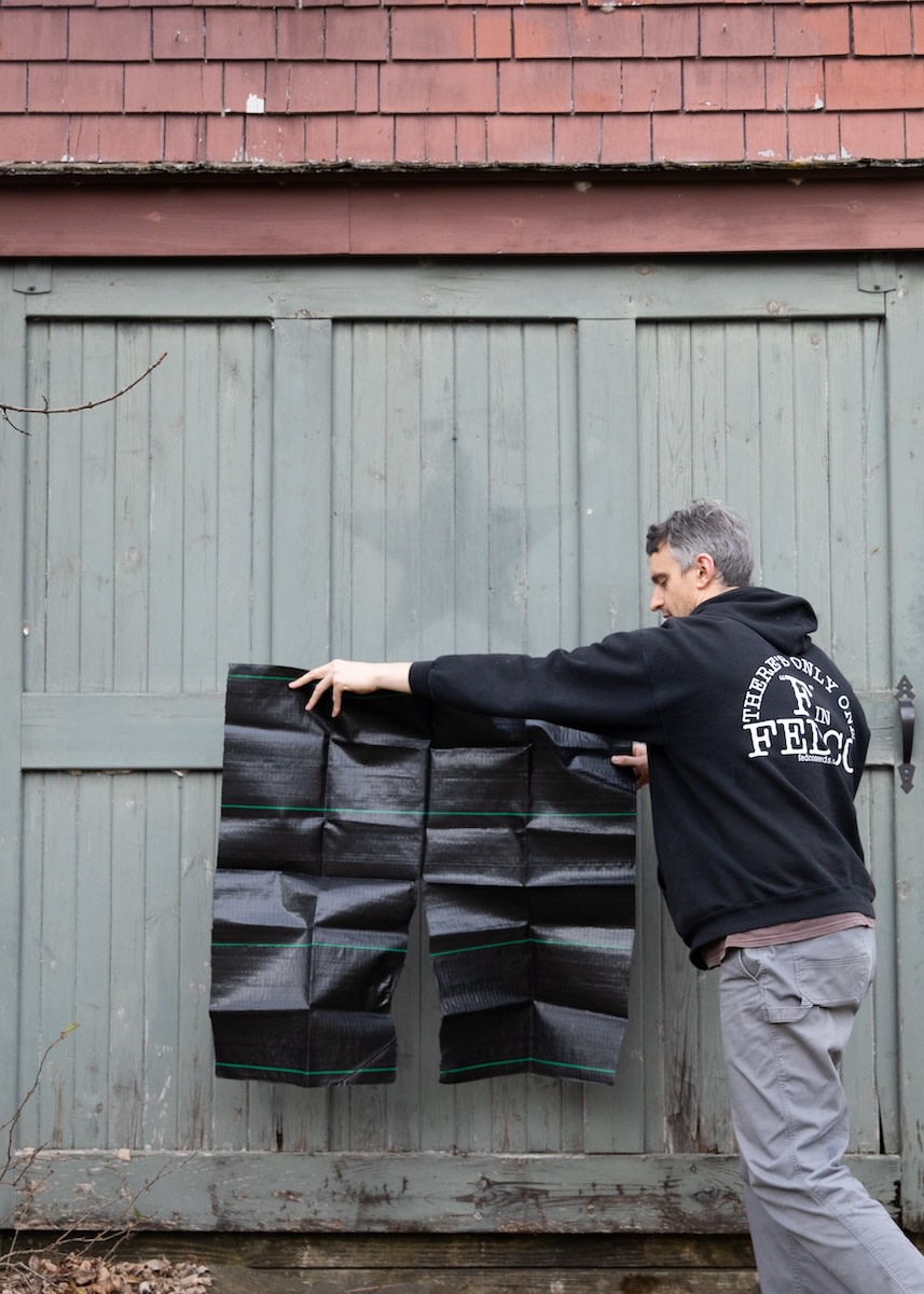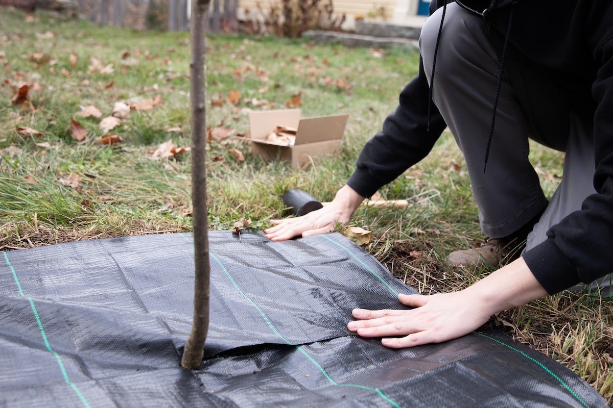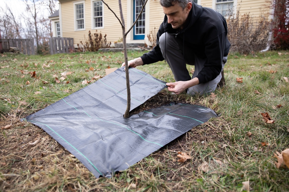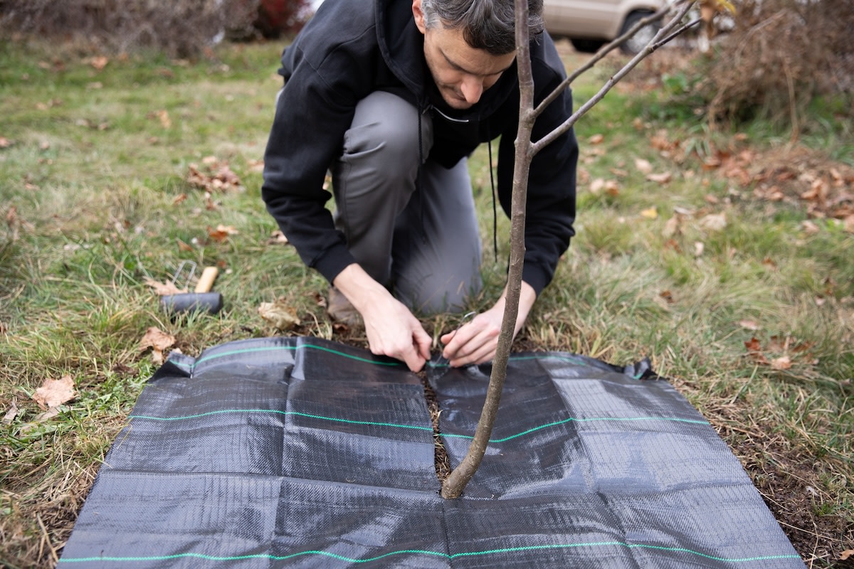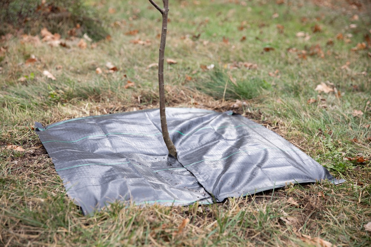 Weeds swallowing up your trees and perennials is a buzzkill. With these large 36x36" long-lasting weed-control mats, you can say goodbye to tiresome weeding around your plants. The fabric is essentially the same as our Woven Ground Cover; durable but also allows water penetration, so it is fully compatible with our Orchard Irrigation Kit. Each square mat has a slit, so you can slip it around the plant’s base. We recommend securing mats with Earth Staples. Black with stripes every 12". To discourage vole habitation and damage, do not apply mulch on top of the fabric, and do keep Tree Guards installed November 1st-May 1st.