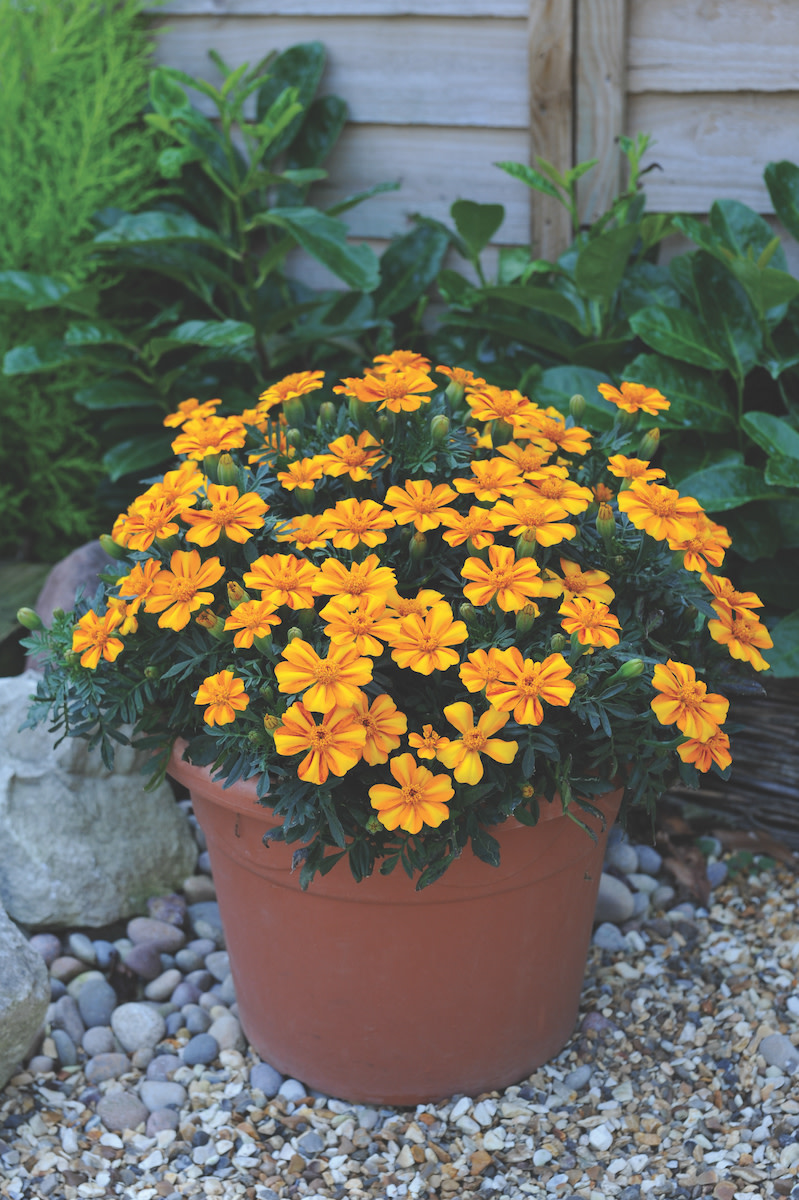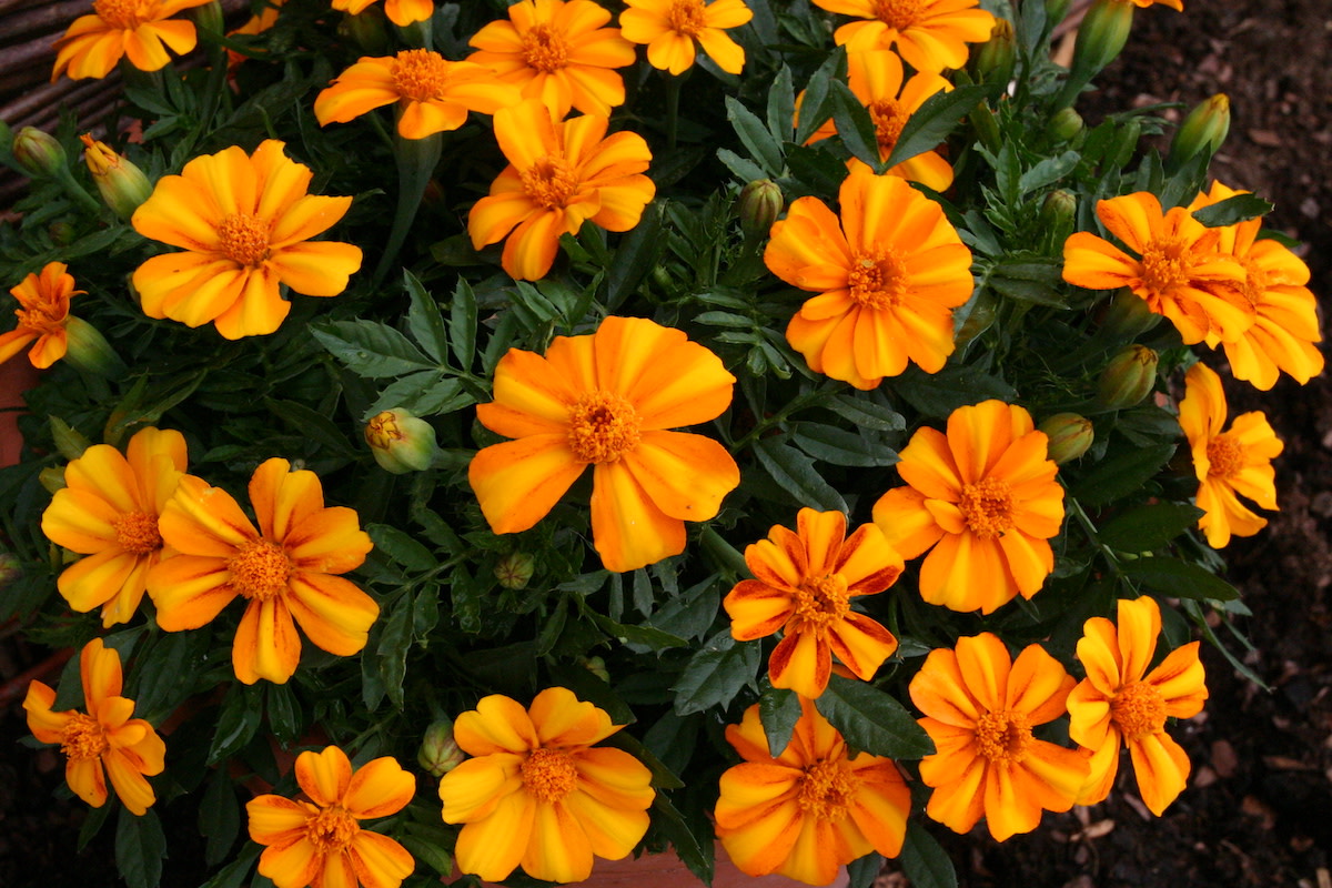 Annual. This darling’s variegated petals of dark and light orange swirl around an orange center button, giving the effect of a tiny circus tent. Plentiful 2½" single-petaled flowers set early on semi-mounded 8" bush. Blooms strong until frost, championing orange in the garden till the pumpkins take over.