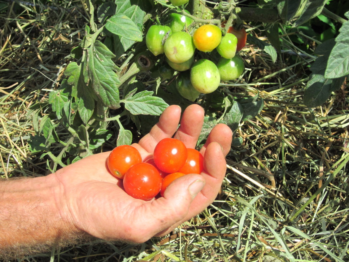 Indeterminate. This productive cherry is the ongoing result of a cross of three famous tomatoes: an heirloom potato-leaf beefsteak and two cherries, one orange and one red. The crossing and selection process for a red cherry with regular tomato foliage began in 1997 and is now complete. The grape tomato in its background lends a rich sweet flavor somewhat akin to that of Sweet Baby Girl, which it replaced. Bred by Relentless. 2007 Fedco introduction.