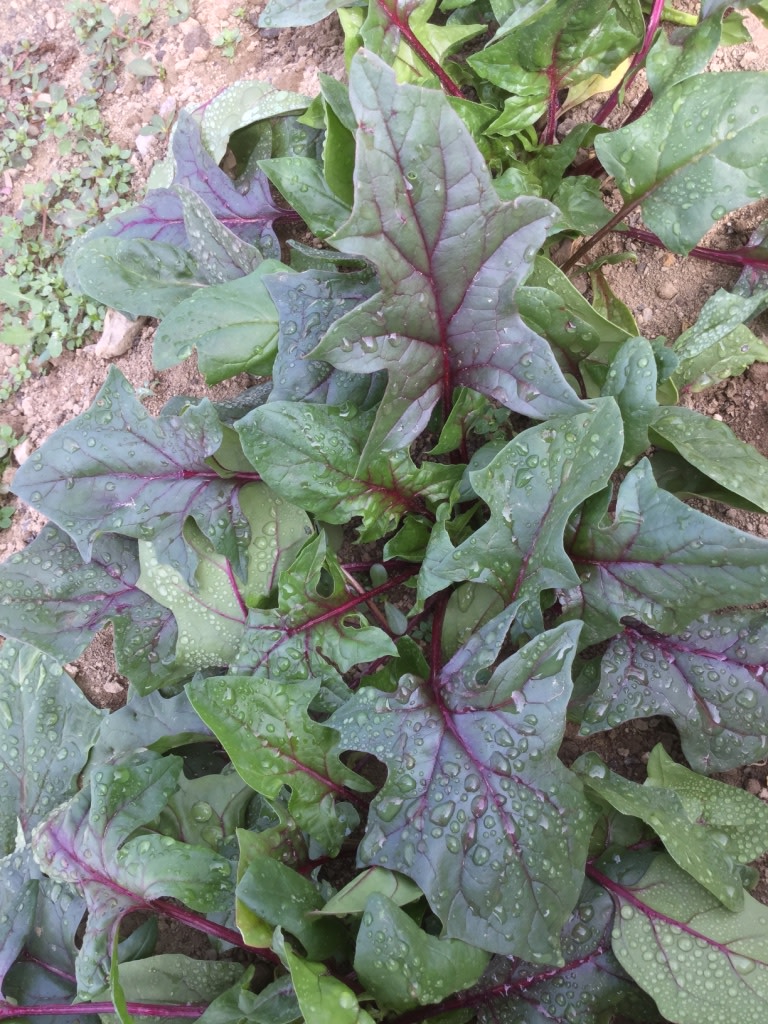 More than a decade ago we carried the variety Bordeaux, but we put that niche spinach on the chopping block when Syngenta bought out supplier Daehnfeldt. We’re happy to list Beaujolais, a very similar wine-themed organic varietal developed by our friends at Uprising Seeds on their farm in eastern Washington wine country. Be forewarned: this spinach bolts quickly so is best grown in the cooler ends of the season. Prized as a baby green for its striking magenta-red stems and veins in deep green arrowhead leaves. Has the characteristic shine of young beet greens, but tastes milder and sweeter in a salad mix. Nikos found the leaves from bolted plants still quite delicious. To borrow the words of Jonathan Swift, this beaujolais should be eaten, it is too good to be drunk.