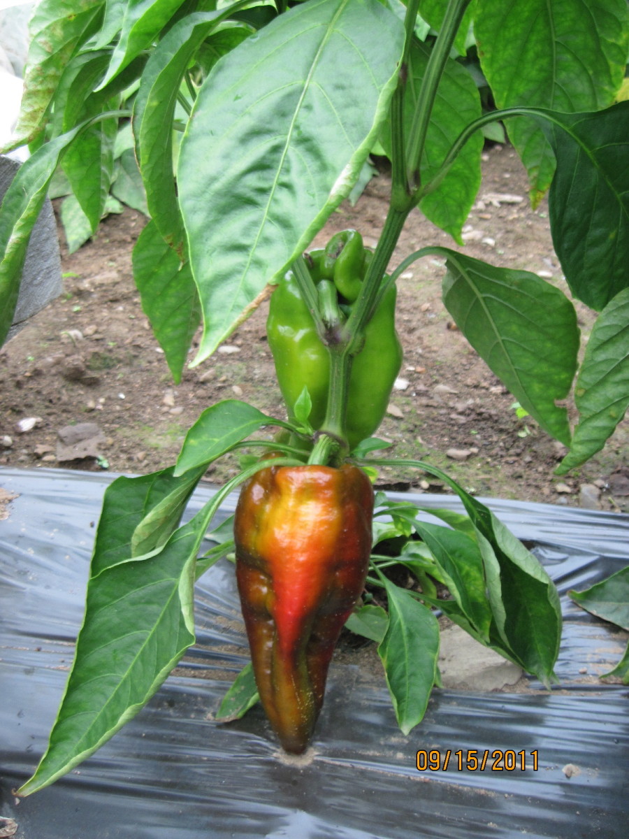 Early for its size and a heavy producer in normal years, sets several pendulous shiny horn-shaped 6" red-orange fruits per plant, 3" wide at the shoulders, tapering to a blunt point. Both sweet and with heat. Most of its mild spice is in its ribs so you can excise those if you wish. Karen Orso writes from California in the Eastern Sierra–Great Basin region, “Beaver Dam Pepper worked wonderfully for us this summer in our garden’s 5,000' elevation in sandy loam with 5% humidity.” Heirloom brought to Beaver Dam, Wisconsin, in 1912 by the Joe Hussli family. 500–1,000 Scovilles.