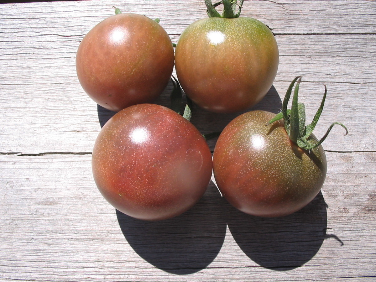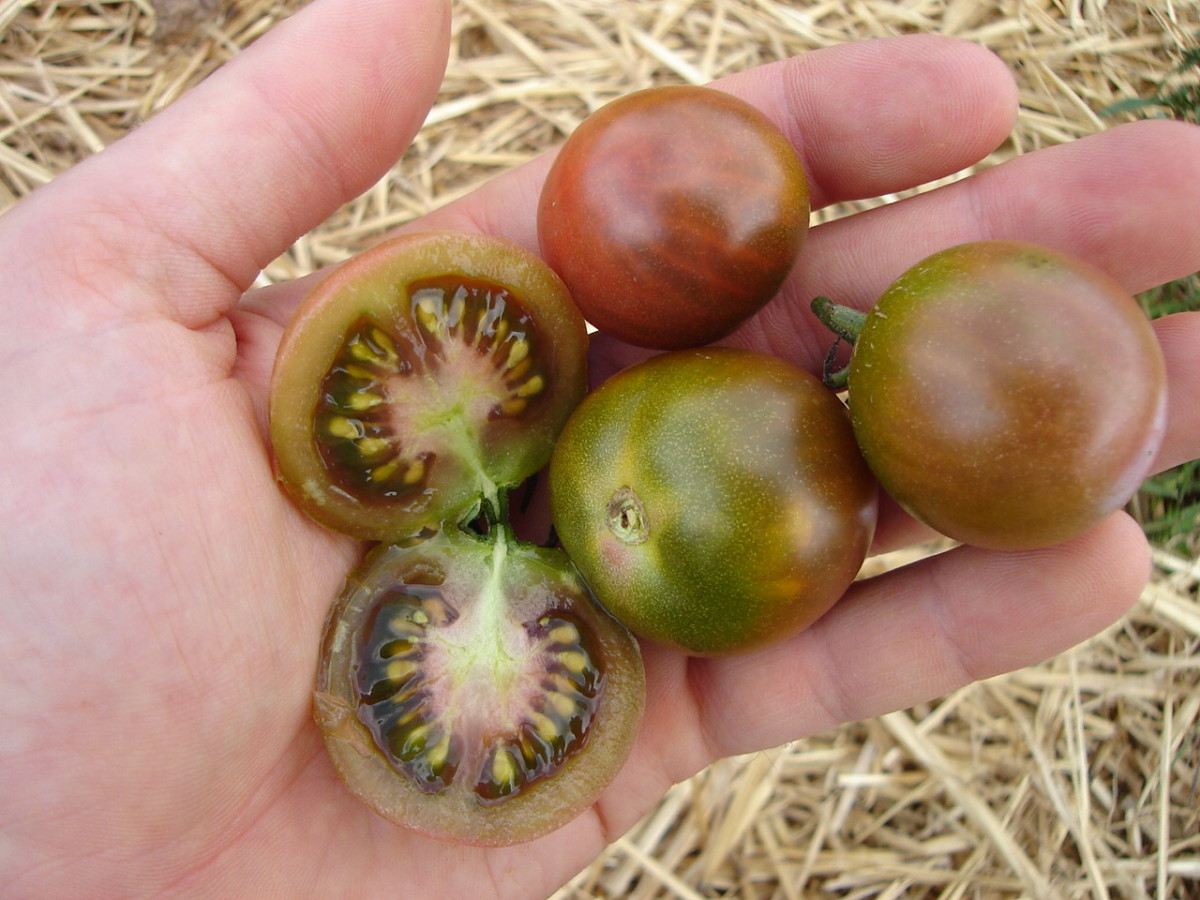 Indeterminate. Two-bite cherries (avg 14–28g) with the dusky color and complex flavor typical of the best black tomatoes, juicy and delicious. Somewhat late for a cherry tomato, but worth the wait. Fruit ripens slowly and individually until frost. Examine each plant closely at picking time: the dark-hued cherries are easy to lose in the foliage. Best flavor if left to ripen on the vine till nice and dark. Seems to tolerate the usual tomato diseases but fruits will crack readily in rainy weather. Combine with Sungold and any bright red cherry for a lovely display. Brix 7. Developed by Vince Sapp of Tomato Growers Supply and released 2003.