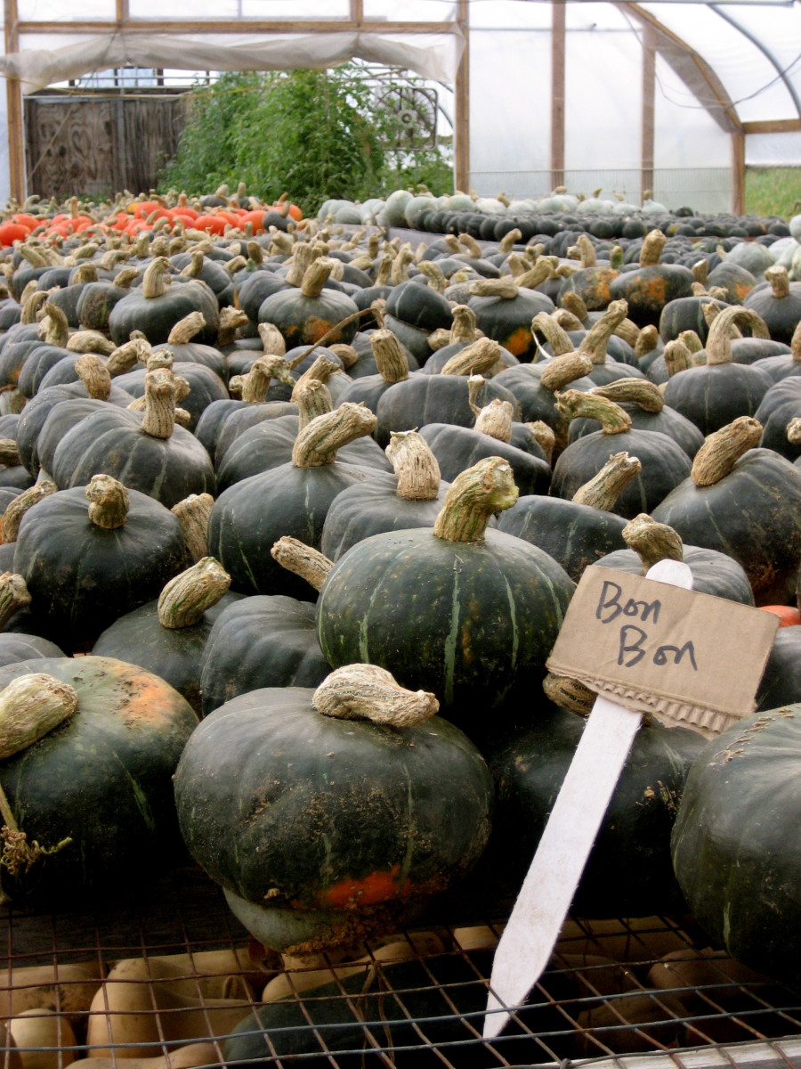 Bonbon’s advantages over the old Burgess strain are slight, but across the board they add up. First, consistency. Burgess can be variable, and in stressed seasons that may matter. Second, productivity. At 4–5 lb Bonbon is slightly the larger of the two, and at 4 fruits per plant, may yield more fruits as well. Third, appearance. Bonbon never fails to have the prominent grey button at its base that is the hallmark of the true buttercup. Fourth, flavor. Each at its best has superb flavor, but Bonbon is more likely to deliver it. Under highly fertile and favorable conditions, as when CR's rampant vines crawled through a manure pile during the very warm 2015 season, production can be astonishing.