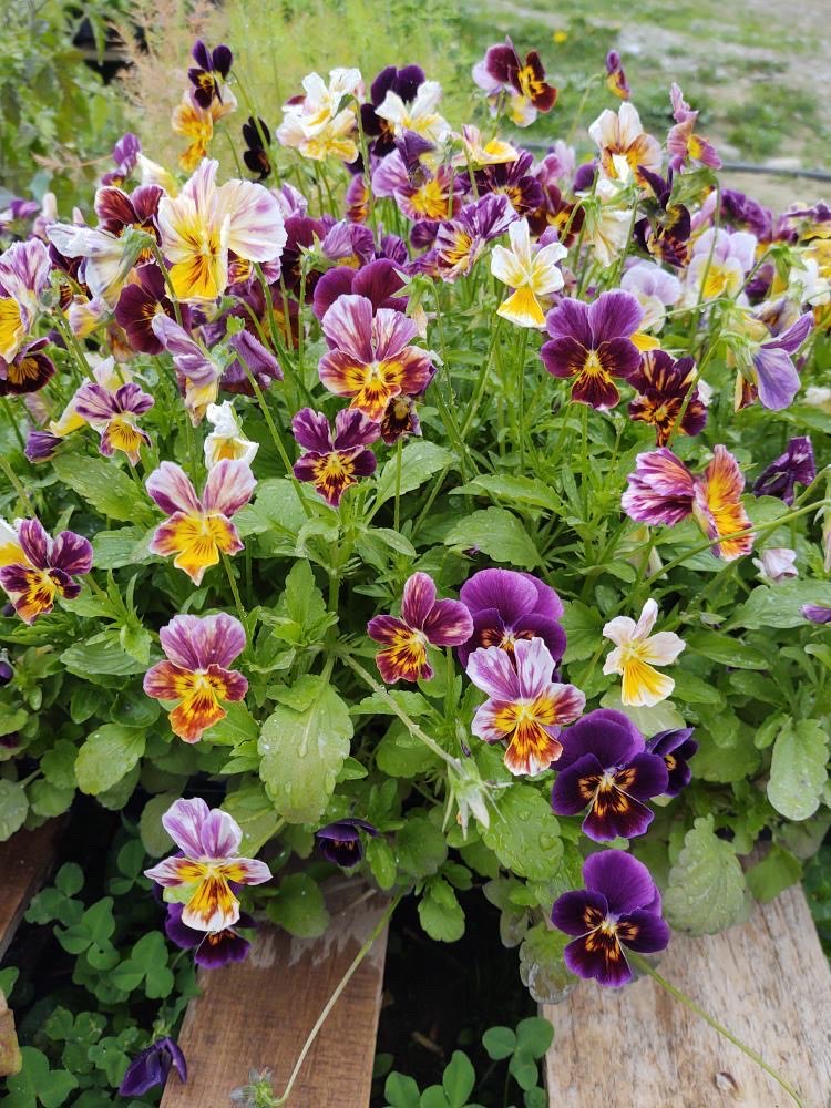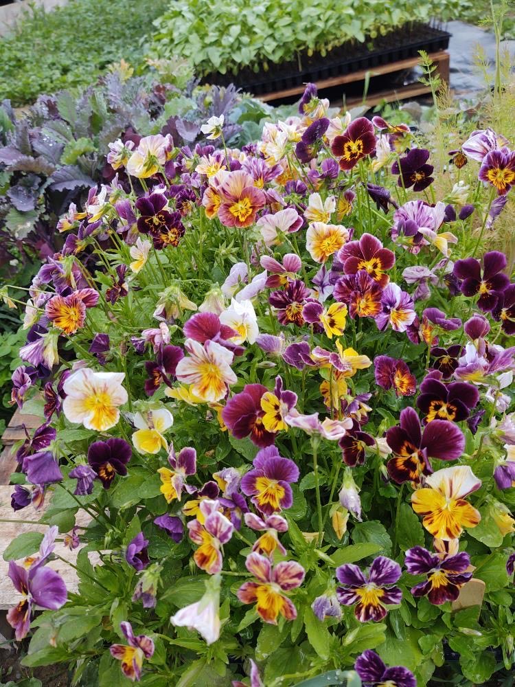 Short-lived perennial. As if an artist had taken a fine brush to paint delicate bright stripes on its palette of solid colors. Purple, pink, yellow and light blue striped with white and yellow strokes. Donna Dyrek’s blossomed the first of July from an April 8 start. Pansies are among the first to revive in the spring. Dwarf 6" plants with large fragrant faces. ~1,100 seeds/g.