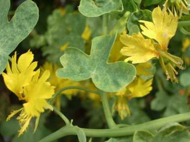 Annual. A climbing relative of the nasturtium. Profuse 8' vines with unique deeply lobed frog-toe–like foliage and clusters of lacy-petaled golden-yellow flowers from midsummer till frost. Gorgeous when grown on a sturdy tripod with morning glories and/or Scarlet Runner beans. Grows in shade but prefers full sun. Annual. ~15 seeds/g.
