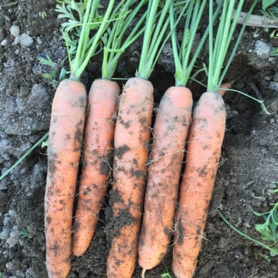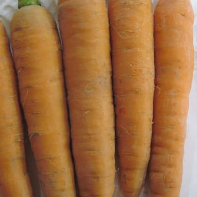 Daucus carota (70 days) F-1 hybrid. 6–7" slender carrot similar to Yaya, but with slightly later maturity and more upright tops. Good for storage.