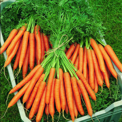 Daucus carota (58 days) F-1 hybrid. Uniform 6" smooth orange Nantes-type carrot. Harvest baby or full-size. Excellent flavor, both fresh and in short storage. Strong tops.